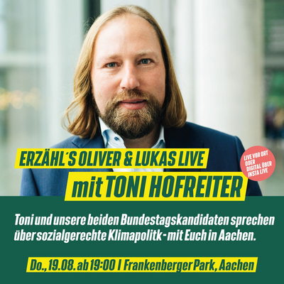 Toni Hofreiter kommt nach Aachen um mit unseren beiden Bundestagskandidaten Oliver Krischer und Lukas Benner UND mit euch über sozialgerechte…